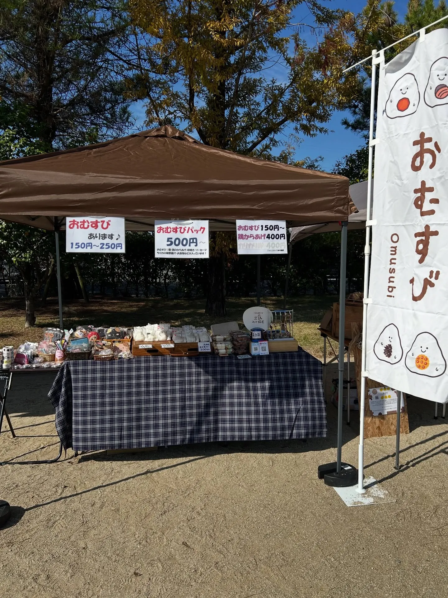 こんにちはみけ猫屋です!諏訪公園で行われている動物愛護フェスタに出店しています。今日はおむすび3種類(しお・わかめ・カリカリ豚)とおむすびパック(おかずとおむすび2個入り)と唐揚げを販売しています。とても良い天気になりました。キッチンカーもたくさん出ていますよ!みけ猫屋はこれからお昼ご飯を食べようと思っていますがら何を食べようかなぁーと悩んでいます。