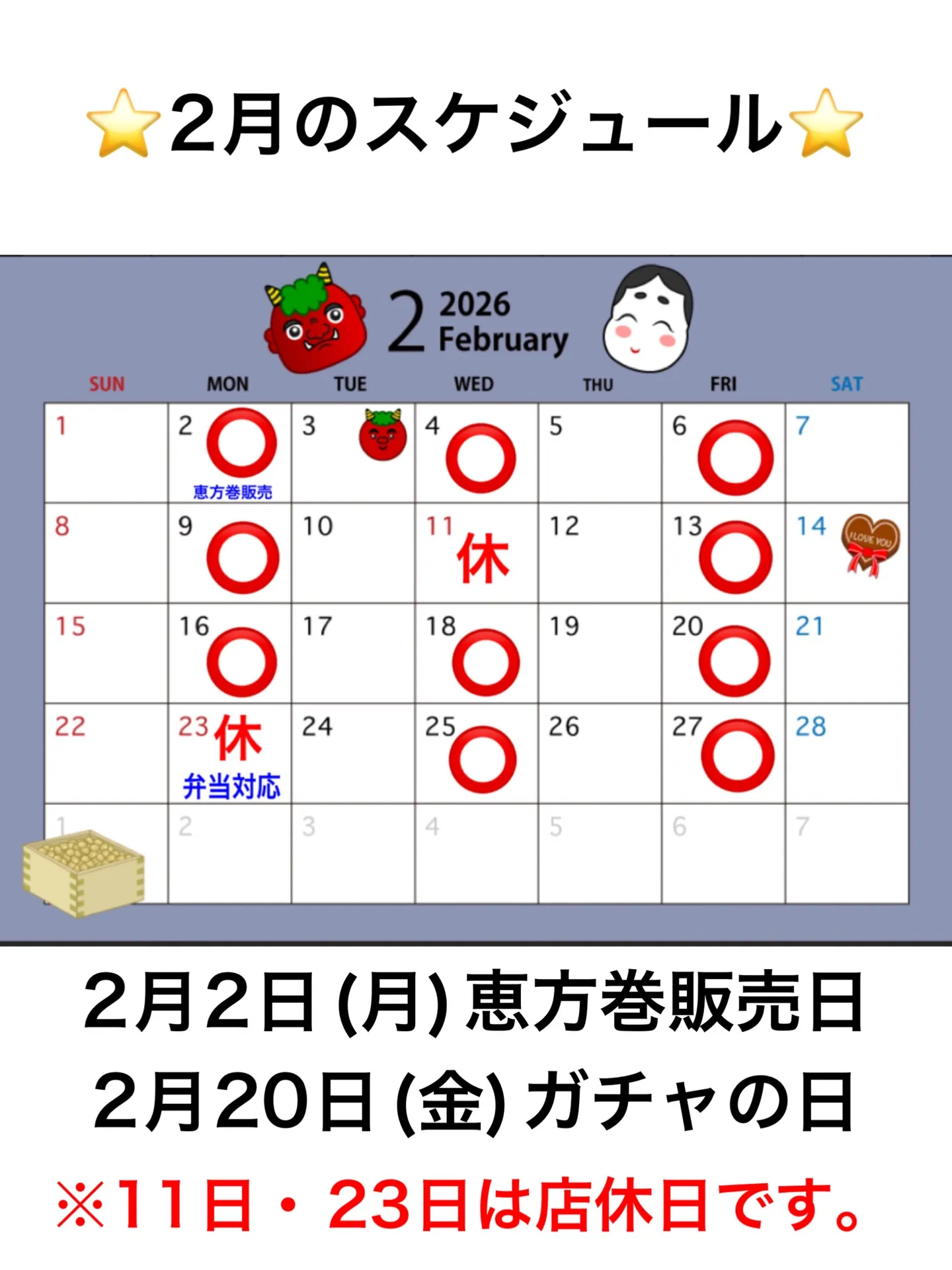 2月は祝日が2回ありますので、お店はお休みとなります。それに伴いまして、ガチャの日は2月20日(金)に行います。素敵な賞品を準備していますので、ガチャにチャレンジしてみてくださいね!1回100円です。