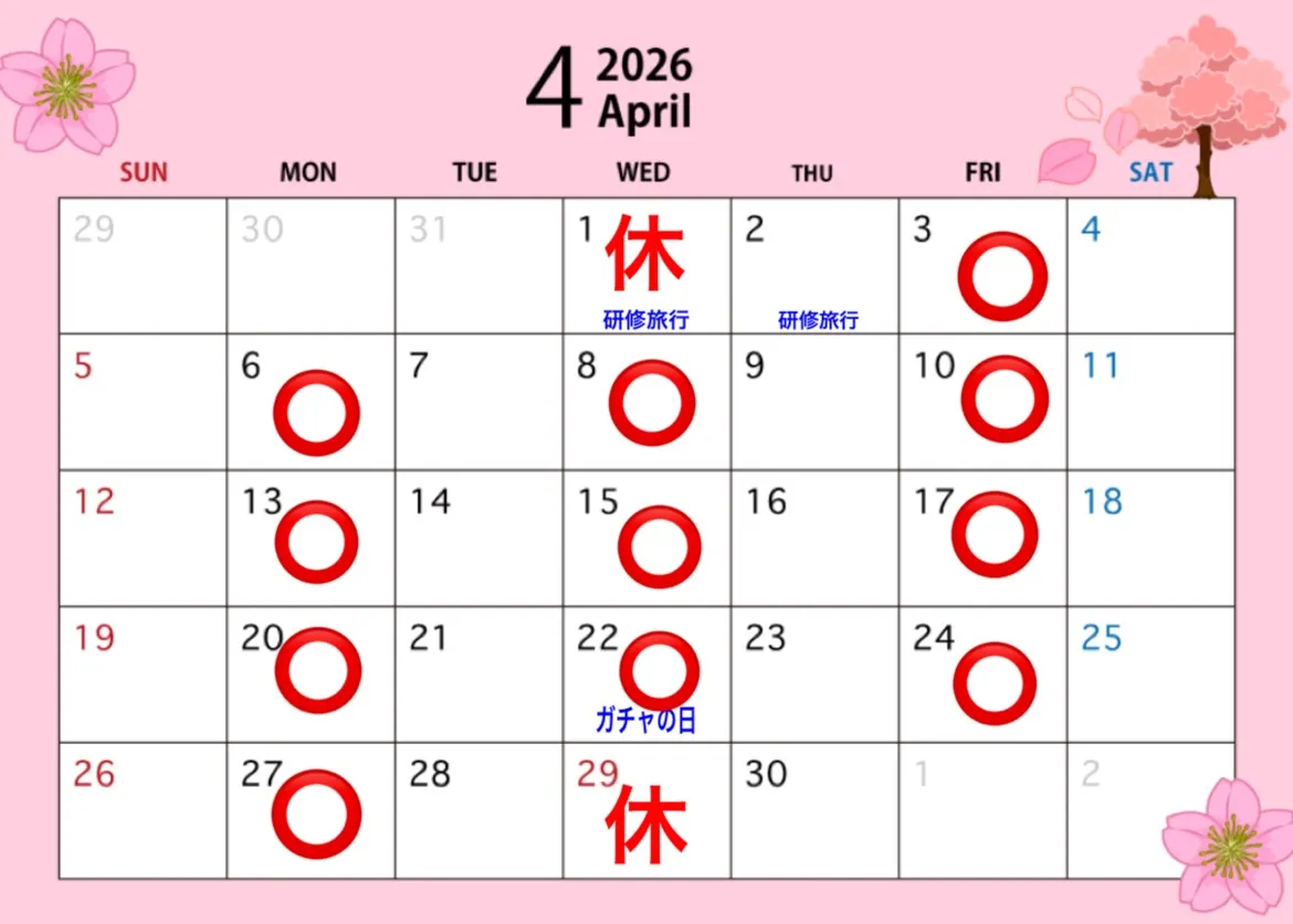 4月1日(水)は研修旅行に行くためお店はお休みとなります。1日、2日としっかり勉強して『食』を楽しんで来たいと思います。4月の『ガチャの日』は4月22日(水)ニャンニャンの日です。賞品を充実させておきますのでガチャを回しに来てくださいね♪それと4月29日(水)は昭和の日で祝日ですのでお店はお休みになります。今月は水曜日休みが2回ありますのでお間違いのないようにお願いします。